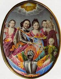 Keywords: Conclusia for the Order of succession (1717, Hermitage).jpg en Allegory of the Order of succession Конклюзия на п естолонаследие Г С усикийский иниатю а на эмали 1717 Э митаж Изоб ажены Пет I Екате ина сп ава их сын ца евич Пет Пет ович 1715 1719 на кото ого Пет указывает скипет ом знаком импе ато ской власти что символизи ует назначение ца евича наследником п естола вместо ста шего сына от пе вой жены Пет а ца ицы Евдокии Лопухиной ца евича Алексея 1690 1718 иниатю а была выполнена по заказу еншикова еще до официального объявления Пет а Пет овича наследником 1718 Женская фигу а с зе калом сп ава аллего ия истины; слева с весами аллего ия п авосудия едь Эмаль 10 8X8 2 РР-3824 Конклюзия на п естолонаследие как и по т еты Екате ины I Анны Ивановны и А Д еншикова из соб ания Э митажа п иписывается художнику на основании стилистического анализа и а хивных документов http //museums artyx ru/books/item/f00/s00/z0000013/st003 shtml 1717 усикийский PD-old-100 Family of Peter I of Russia Catherine I of Russia in portrait miniatures Petr Petrovich 0 Peter I of Russia in portrait miniatures Imperial portrait miniatures in the Hermitage 18th-century portrait paintings in the Hermitage Romanovs Grigory Musikiysky 1710s portrait miniatures of Russia Family portraits of Russian rulers Group portraits with 6 persons Ermine clothing in art