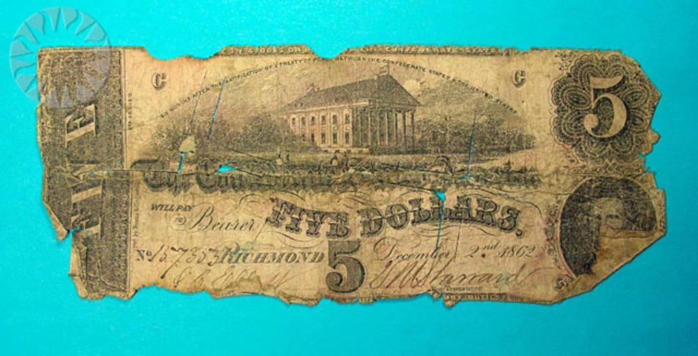 | Keywords: legendary coins legendarycoins numismatics money smithsonian probably public domain probablypublicdomain SI Neg. 2005-27383. Date: 9/1/2005...Like the fledgling United States during the American Revolution, the Confederacy struggled to keep its money in existence during the American Civil War, 1861-1865. Coinage had never been all that plentiful in the states that now made up the Southern Confederacy. It was a debtor area, with coinage flowing out for purchase of manufactured goods about as quickly as it flowed in from the sale of agricultural ones. .And just as during the Revolution, a new nation lacking precious metals must issue paper money to support a war. The Confederacy was even more dependent on paper currency than had been an earlier generation of patriots. During the 85 years between 1776 and 1861, the proportion of people tied to a monetary economy had grown, even in the agricultural South. .There, a bewildering variety of authorities now began to issue currency-the new central government, the Confederate States of America; the individual states; cities and towns; private banks both old and new; and even private citizens..This object tells us something about popular attitudes of the day. As with Continental and state notes in the 1770s, there was an almost superstitious aversion to allowing Confederate notes to fall to pieces. So they would be sewn together, or more frequently glued back together, reinforced with any stray bits of paper deemed fit for the job. This five-dollar bill was reinforced with part of a low-value (ten-cent) note from Mississippi. Specialists call this sort of minor currency "scrip", and it played an essential role on the lower end of the monetary scale during the early and middle phases of the war. .By the way, that's Confederate Treasury Secretary C. G. Memminger peaking out from behind the fold at lower-right..Click here to view the obverse...Credit: Tom Mulvaney (Smithsonian Institution) SI Neg. 2005-27383. Date: 9/1/2005...Like the fledgling United States during the American Revolution, the Confederacy struggled to keep its money in existence during the American Civil War, 1861-1865. Coinage had never been all that plentiful in the states that now made up the Southern Confederacy. It was a debtor area, with coinage flowing out for purchase of manufactured goods about as quickly as it flowed in from the sale of agricultural ones. .And just as during the Revolution, a new nation lacking precious metals must issue paper money to support a war. The Confederacy was even more dependent on paper currency than had been an earlier generation of patriots. During the 85 years between 1776 and 1861, the proportion of people tied to a monetary economy had grown, even in the agricultural South. .There, a bewildering variety of authorities now began to issue currency-the new central government, the Confederate States of America; the individual states; cities and towns; private banks both old and new; and even private citizens..This object tells us something about popular attitudes of the day. As with Continental and state notes in the 1770s, there was an almost superstitious aversion to allowing Confederate notes to fall to pieces. So they would be sewn together, or more frequently glued back together, reinforced with any stray bits of paper deemed fit for the job. This five-dollar bill was reinforced with part of a low-value (ten-cent) note from Mississippi. Specialists call this sort of minor currency "scrip", and it played an essential role on the lower end of the monetary scale during the early and middle phases of the war. .By the way, that's Confederate Treasury Secretary C. G. Memminger peaking out from behind the fold at lower-right..Click here to view the obverse...Credit: Tom Mulvaney (Smithsonian Institution) |