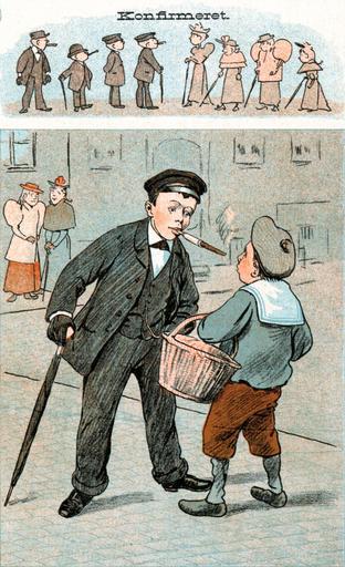Keywords: Confirmationed1894page324Puk.jpg The one boy is grown-up and is a man and the pal is only a boy 1894 caricature from the Danish Puk magazine showing teen-agers immediately adopting inappropriately adult manners after their confirmation a religious ceremony which to some degree marked one's coming of age in that time PD-old Fashion in 1894 Adolescence religious caricatures Confirmation in art Smoking men in art Boys in art Caricatures of teenagers Puk magazine Sailor suits in art Smoking boys in art Images by Haabet People in 1894 1894 in Denmark Teenagers in Denmark Quarrels 1894 cartoons |