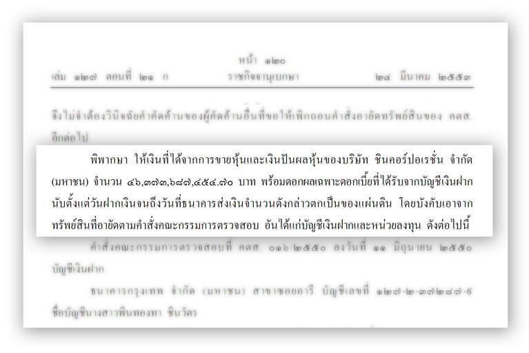 | Keywords: ConfiscatingPart-Judgment-Gazette-04.jpg en Page 120 of the Government Gazette Volume 127/Part 21 A/Page 1-124/Dated March 24 2010 on which the Judgment of the Supreme Court of Thailand's Criminal Division for Holders of Political Positions in the Black-Number Case No CDHPP 14/2551 and the Red-Number Case No CDHPP 1/2553 'Attorney-General v Thanksin Shinawatra et al ' was published On this page it is the part of the Judgment which adjudicates half of Thaksin Shinawatra's fortune be confiscated This is a page of a judicial decision which is not a copyright-work under Thailand's Copyright Act BE 2537 1994 th หน้า ๑๒๐ ของ ราชกิจจานุ บกษา ฉบับที่ ๑๒๗/ตอนที่ ๒๑ ก/หน้า ๑-๑๒๔/ลงวันที่ ๒๔ มีนาคม ๒๕๕๓ ซึ่งลงประกาศ คำพิพากษาศาลฎีกาแ นกคดีอาญาของ ู้ดำรงตำแหน่งทางการ มือง ในคดีหมาย ลขดำที่ อม ๑๔/๒๕๕๑ และคดีหมาย ลขแดงที่ อม ๑/๒๕๕๓ ระหว่าง อัยการสูงสุด กับพันตำรวจโททักษิณ ชินวัตร และพวก ในหน้านี้ ป็นส่วนที่พิพากษาให้ทรัพย์สินของพันตำรวจโททักษิณ ชินวัตร ตก ป็นของแ ่นดิน ภาพนี้ ป็นส่วนหนึ่งของคำวินิจฉัยขององค์กรตุลาการไทย ซึ่งมิใช่งานอันมีลิขสิทธิ์ตามพระราชบัญญัติลิขสิทธิ์ พ ศ ๒๕๓๗ own Clumsy 2010-04-19 PD-TH-exempt 100px 100px Thaksin Shinawatra's assets confiscation case Royal Thai Government Gazette |