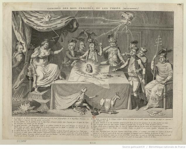 Keywords: Congres des rois coalises.jpg Artwork Barnabé Augustin de Mailly 1732-179 LangSwitch A French emblematical design with numbers referring to an explanation engraved below the print The sovereigns of Europe surround a rectangular council-table on three sides On the table is a map inscribed ˜République française une et indivisible ™ in the centre of which is a cap of liberty emitting rays ; A cock enters by an oval window above the door grasping a level which emits flames and thunderbolts directed against the crowns of Catherine II Francis II Charles IV and George III ; Immediately behind '1' stands Francis II his crown clutched by a double-headed Habsburg eagle falls from his head; serpents emerge from it One hand holds the map the other is raised with a predatory ; Beside him left is Frederick William II pointing to the map his left hand on the shoulder of Francis II looking round at Catherine II who is seated at the head of the table; his broken crown falls from his head ; On a throne left on a dais and under a canopy of heavy draperies sits Catherine II her left foot planted on the council-table her arms held out towards the map ; The dismasted ship and burning straw are in the foreground on the extreme left Behind Catherine lurking in the draperies of her throne stands Stanislaus II of Poland on the extreme left frowning over his shoulder at the council-table his crown is broken ; Between and behind 3 and 4 is Victor Amadeus III of Savoy his crown obscured and displaced by a small solid cloud; he has a grotesquely long nose ; Charles IV his crown on fire and horns sprouting from his forehead stands beside Francis II his hand held before his face Next right at the end of the table facing Catherine stands George III his crown on fire and threatened by a small solid cloud his expression one of foolish vacuity Before him on the table are piles of coins which extend across the map of France; he holds two in his right hand which rests on the table Behind him stands Pitt his fingers ending in talons his legs in hoofs; he directs the King's actions and pushes a hooked pole resembling a boat-hook on to the map beside 'Toulon' They are ; On the extreme right sits the Pope holding his triple cross his crown partly obscured by a small cloud In his left hand he holds a scroll headed 'Bulle' and ending with 'nulle' At his feet the dove of the Saint-Esprit the head irradiated lies dead ; In the foreground emerging from under the table-cloth is a monkey Ferdinand IV of Naples the order of the Golden Fleece hung round his neck; he looks towards the Pope Beneath him is a damaged heraldic shield with the arms of the House of Bourbon On the ground beside him are a toy horse on wheels and a crown pierced by a stag's antlers ; The annual tribute of a white hackney from the King of Naples to the Pope had been abolished in 1776 Caricature avec des numéros faisant référence à une explication gravée en dessous Les souverains de l'Europe tiennent une réunion sur les trois côtés d ™une table Sur celle-ci se trouve une carte sur la quelle est inscrite « République française une et indivisible » au centre émergeant des cieux se trouvent les éclairs de la liberté 1794 6 5 Technique etching stipple engraving Size cm 51 39 Institution Bibliothèque nationale de France département Estampes et photographie place of discovery object history exhibition history credit line fr fr Hould 1988</sup> This order was confirmed January 14 1794 with a deposit of 1 000 pounds<sup>Miller 2011</sup> It is delivered June 5 1794<sup>Hould 1988</sup> L ™estampe est commandée par le Comité de salut public le Date 1793 10 15 à 900 exemplaires 600 en noir 300 en couleur <sup>Hould 1988</sup> Cette commande est confirmée le 1794 1 14 avec un accompte de 1 000 livres<sup>Miller 2011</sup> Elle est livrée le 1794 6 5 <sup>Hould 1988</sup> Cf cite book Mary Ashburn Miller Cornell university press 3 Lightning Strikes A Natural History of Revolution Violence and nature in the french revolutionnary imagination 1789-1794 978-0-8014-4942-0 Ithaca and London Cornell university press 2011 85 en Miller <br> cite book Claudette Hould Michel Vovelle La Sorbonne La propagande d ™Ã©tat par l ™estampe durant la Terreur Les images de la Révolution française 2 2-8594-4161-0 Paris La Sorbonne 1988 30-37 fr Hould Congres de rois coalises jpg 100 accession number RESERVE QB-370 26 -FT 4 De Vinck 4358 place of creation ark /12148/btv1b6948182n PD-GallicaScan PD-old-100 Catherine II of Russia in engravings George III of the United Kingdom Frederick William II of Prussia Stanislaus II August of Poland Victor Amadeus III of Sardinia Charles IX of France William Pitt the Younger Pius VI Ferdinand I of the Two Sicilies French Revolution in art Prints on the French Revolution Caricatures on the French Revolution |