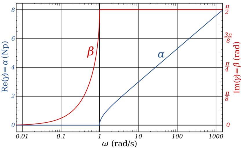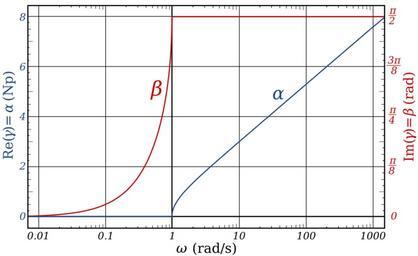 Keywords: Constant-k Filter Transmission Parameters.svg transmission parameters <math>\gamma \alpha + i \beta</math> of a prototype low-pass constant-k filter of a single half-section <br> <math>\gamma \alpha + i \beta \begin cases 0 + \sin -1 \frac \omega \omega_c \omega < \omega_c \\ \cosh -1 \frac \omega \omega_c + i \frac \pi 2 \omega > \omega_c \end cases </math> α is measured in nepers and β in radians own Inductiveload 2009-11-23 Mathematica Code <pre><nowiki> l 1; c 1; wc 1/Sqrtl c; gamw_ Piecewise I ArcSinw/wc w < wc ArcCoshw/wc + I Pi/2 w \GreaterSlantEqual wc alphaw_ Regamw; betaw_ Imgamw; LogLinearPlot alphaw betaw w 0 01 10 3 PlotRange -> All PlotPoints -> 1000 </nowiki></pre> Transmission parameters Constant-k filters |