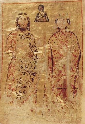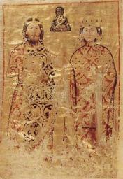 Keywords: Constantine Palaiologos sebastokrator and Eirene.jpg sebastokrator Constantine Palaiologos and his wife Eirene from the Typikon of the Monastery of Our Lady of Certain Hope Lincoln Typicon Oxford Bodleian Library Lincoln College Ms Gr 35 Cplakidas 1328-1344 PD-old-100 Medieval miniatures of Byzantine emperors Palaiologos dynasty Portrait miniatures of Byzantine Empire Lincoln Typikon Ktitor Illuminated manuscripts in the United Kingdom Ornamental textiles in art Double-headed eagles Konstantinos Palaiologos Byzantine textiles |