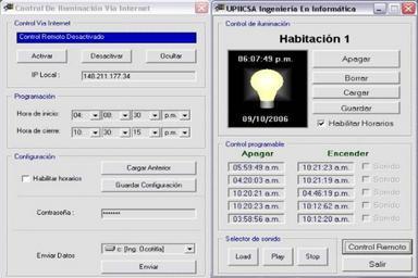 Keywords: ConstrolDeIluminacionPorComputadora2.jpg Software que permite encender o apagar la luz con solo presionar un botón además podemos establecer horarios de tal manera que podemos tener hasta 5 horarios diferentes en los que el foco debe encenderse y 5 en los que el foco debe apagarse en todo momento podemos habilitar o deshabilitar los horarios y el control via internet Del lado izquierdo esta la configuración del control remoto aquí podemos activar manualmente el control remoto pero también podemos establecer un horario con lo cual podemos hacer que el control via internet solo este habilitado a cierta hora del dia más abajo tenemos la sección de los datos de conexión que son la IP y la contraseña la constraseña se puede cambiar en cualquier momento y estos dos datos se envian a una memoria USB para que al llegar al trabajo o a donde quiera que vayamos solo insertemos nuestra memoria y podamos facilmente cargar los datos con un clic así nos evitamos tener que preocuparnos por aprendernos la contraseña y estar verificando la IP 2006-10-09 own assumed Cyborg~commonswiki Home automation |
