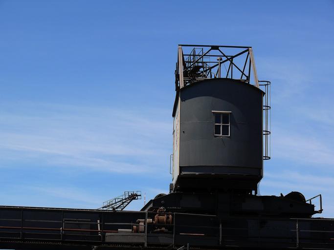 Keywords: construction baukran site port lifting device sky crane cranes water clouds industrial heritage