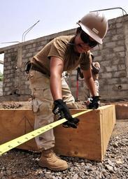 Keywords: Construction in Djibouti DVIDS311774.jpg en Seaman Selina Rodriguez constructionman assigned to Naval Mobile Construction Battalion 7 Combined Joint Task Force-Horn of Africa Detachment checks the measurements on a concrete form at Ecole 5 a five-room school under construction near Camp Lemonnier 2010-08-18 Petty Officer 2nd Class Nathan Laird https //www dvidshub net/image/311774 100818-N-+++++-028 2010-08-23 20 55 CAMP LEMONNIER DJ PD-USGov-Military-Navy Combined Joint Task Force - Horn of Africa Camp Lemonnier Images from DoD uploaded by Fæ Photographs by Nathan Laird |