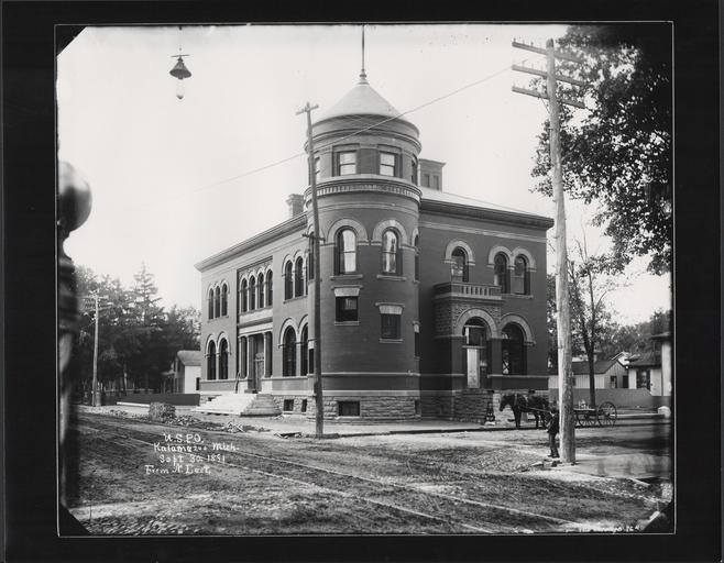 Keywords: kalamazoo history public library photography sidewalk wagon postoffice house construction streetlight roads michigan photo border blackandwhite architecture outdoor building black and white Construction of Post Office at Burdick and South Streets, looking southwest, September 30, 1891 . Building almost complete, except doors not hung and sidewalk not poured. Houses visible at either side. Good view of street light in upper left corner. KPL catalogue number P-275 Construction of Post Office at Burdick and South Streets, looking southwest, September 30, 1891 . Building almost complete, except doors not hung and sidewalk not poured. Houses visible at either side. Good view of street light in upper left corner. KPL catalogue number P-275 |
