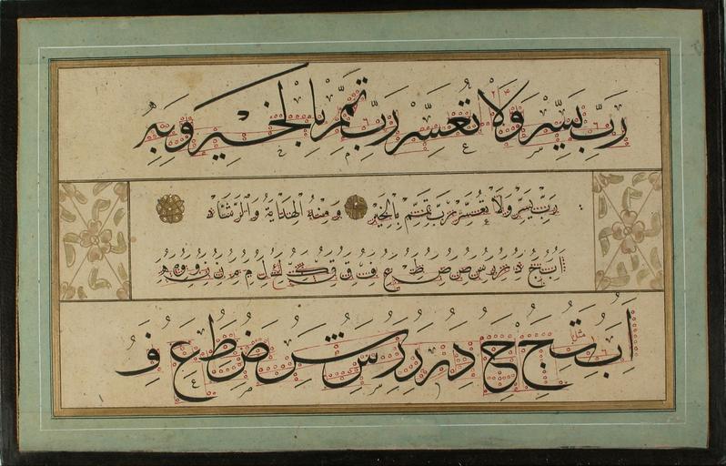 Keywords: Containing Mehmed Şevki Efendi's calligraphies - Murakka (calligraphic album) - Google Art Project.jpg Top Arabic line reads رب يسر ولا تعسر رب تمم بالخير وبه 1829 Containing 602088 Mehmed Şevki Efendi's calligraphies 1829 /collection/sakp-sabanc-museum/artwork/murakka-calligraphic-album-containing-mehmed-sevki-efendis-calligraphies/574847/ Containing Mehmed Şevki Efendi's calligraphies /artist/mehmed-sevki-efendi/4127420/ 4127420 /collection/sakp-sabanc-museum/ Sakıp Sabancı Museum 479109 http //muze sabanciuniv edu/ 12/28/2011 6 21 34 PM /collection/sakp-sabanc-museum/artwork/murakka-calligraphic-album-containing-mehmed-sevki-efendis-calligraphies/574847/ 1863 1863 168 574847 False 1863 3/24/2012 5 16 41 AM 120-0216-MS Sakıp Sabancı Museum Ink colours and gold on paper pasted on cardboard 1860 1870 w258 x h168 mm 1863 False 1 5609756097561 Sakıp Sabancı Museum Object murakka-calligraphic-album-containing-mehmed-sevki-efendis-calligraphies Murakka calligraphic album m 258 special url_id NAGDVST4V0GoXw PD-old-70-1923 Google Art Project works by Mehmed Şevki Efendi Islamic calligraphy |