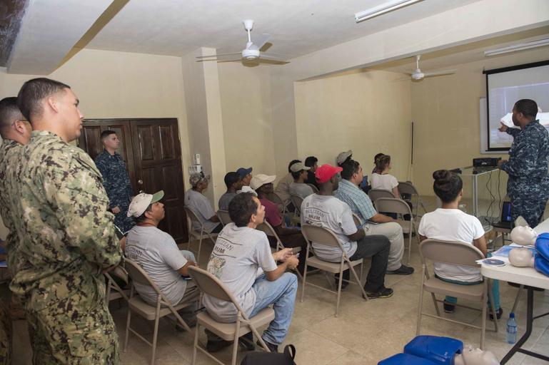 Keywords: Continuing Promise 2015 150413-N-PD309-001.jpg en 150413-N-PD309-001 LA DEMOCRACIA Hospital Corpsman 1st Class Ronald L Fells a native of York Pa assigned to Branch Health Clinic Naval Station Norfolk teaches a Basic Life Support course to employees of The Belize Zoo Tropical Education Center as part of Continuing Promise 2015 Continuing Promise is a U S Southern Command-sponsored and U S Naval Forces Southern Command/U S 4th Fleet-conducted deployment to conduct civil-military operations including humanitarian-civil assistance subject matter expert exchanges medical dental veterinary and engineering support and disaster response to partner nations and to show U S support and commitment to Central and South America and the Caribbean 2015-04-13 April 13 2015 https //www dvidshub net/image/1874291 150413-N-PD309-001 2015-04-15 10 00 LA DEMOCRACIA BZ PD-USGov-Military-Navy Naval Station Norfolk Images from DoD uploaded by Fæ Continuing Promise 2015 |