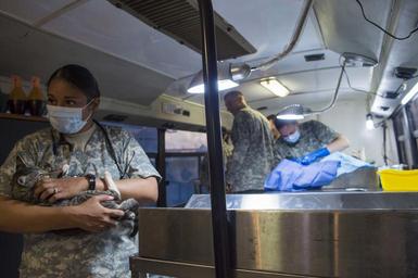 | Keywords: Continuing Promise 2015 150530-N-PD309-033.jpg en Army Sgt Janina Alaniz a native of North Bergen N J and a veterinary technician assigned to Public Health Command District Fort Hood Texas prepares a cat for surgery at a mobile veterinary clinic established during Continuing Promise 2015 Continuing Promise is a U S Southern Command-sponsored and U S Naval Forces Southern Command/U S 4th Fleet-conducted deployment to conduct civil-military operations including humanitarian-civil assistance subject matter expert exchanges medical dental veterinary and engineering support and disaster response to partner nations and to show U S support and commitment to Central and South America and the Caribbean U S Navy photo by Mass Communication Specialist Seaman Deven Leigh Ellis/Released <br>Unit U S Naval Forces Southern Command U S Fourth Fleet 2015-05-30 Petty Officer 3rd Class Deven Ellis https //www dvidshub net/image/1967491/continuing-promise-2015 150530-N-PD309-033 2015-06-01 08 45 COLON PA PD-USGov-Military-Navy Fort Hood Texas Images from DoD uploaded by Fæ |