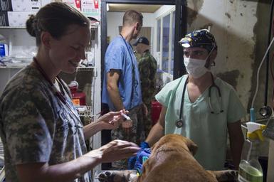 Keywords: Continuing Promise 2015 150716-N-PD309-063.jpg en 150716-N-PD309-063 BUENAVENTURA Colombia July 16 2015 Army Capt Emily Corbin left a native of Boulder Junction Wis and a veterinarian assigned to Public Health Command District Fort Meade Md and a local Colombian veterinarian perform surgery on a dog at a veterinarian site established at Eufermeria Canina Del Grupo Antiexplosivos Urbano during Continuing Promise 2015 Continuing Promise is a U S Southern Command-sponsored and U S Naval Forces Southern Command/U S 4th Fleet-conducted deployment to conduct civil-military operations including humanitarian-civil assistance subject matter expert exchanges medical dental veterinary and engineering support and disaster response to partner nations and to show U S support and commitment to Central and South America and the Caribbean U S Navy photo by Mass Communication Specialist 3rd Class Deven Leigh Ellis/Released <br>Unit U S Naval Forces Southern Command U S Fourth Fleet 2015-07-16 Petty Officer 3rd Class Deven Ellis https //www dvidshub net/image/2076101/continuing-promise-2015 150716-N-PD309-063 2015-07-20 09 24 BUENAVENTURA CO PD-USGov-Military-Navy Fort Meade Images from DoD uploaded by Fæ |