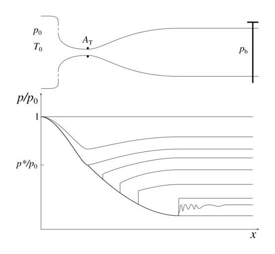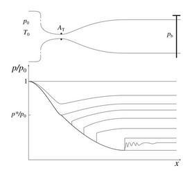 Keywords: Converging-diverging nozzle, pressure distribution during acceleration of flow.svg en The pressure distribution along a pipe with converging-diverging section for various cases of decreasing back pressure 2015-02 own Olivier Cleynen other versions cc-zero Uploaded with UploadWizard SVG physics Convergent-divergent nozzles |