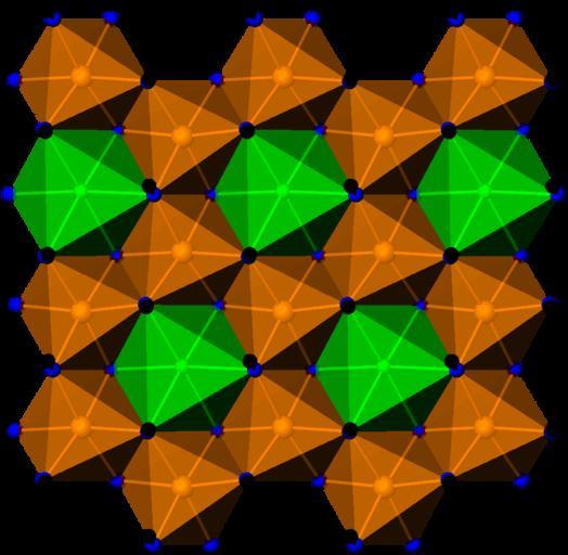 | Keywords: Cookeite r structure Al,Li-layer.png en Crystal structure of cookeite LiAl<sub>4</sub> Si<sub>3</sub>Al O<sub>10</sub> OH <sub>8</sub> monoclinic space group Cc projection onto the a b plane of the layer containing aluminum and lithium Both atoms are represented via their coordination polyhedra octahedra and distributed on all sites The orange octahedra contain a mostly aluminum the green octahedra contain mostly lithium The blue and gray spheres represent the oxygen and hydrogen atoms respectively Data source Zheng H and Bailey S W 1997 Refinement of the cookeite r structure American Mineralogist 82 9-10 1007-1013 own Perditax 2011-07-06 Cc-zero Cookeite Crystal structures in space group number 9 |