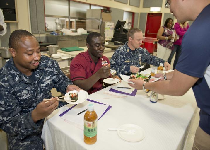 | Keywords: Cooking contest 140418-N-OX321-255.jpg en Naval Air Facility NAF Atsugi Command Master Chief Michael Wilkins right Culinary Specialist 2nd Class Sherland Douglas left and Culinary Specialist 3rd Class Paul Gyabaah both of NAF Atsugi's Far East Cafe prepare to taste a participant's final presentation as the judges for NAF Atsugi's Top Little Chef Sushi Challenge The event consisted of nine children from Shirley Lanham Elementary School and was part of the Month of the Military Child celebration Participants were judged on their presentation use of ingredients and final taste with the grand prize winner receiving a Far East Cafe short sleeved chef's coat U S Navy photo by Mass Communication Specialist 2nd Class Kegan E Kay/Released 2014-04-18 Petty Officer 2nd Class Kegan Kay https //www dvidshub net/image/1257199 140418-N-OX321-255 2014-04-18 04 37 ATSUGI JP PD-USGov-Military-Navy Naval Air Facility Atsugi Images from DoD uploaded by Fæ |