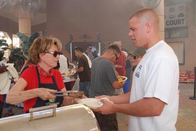 Keywords: Cooks from the Valley Serve Steak in Bahrain DVIDS296311.jpg en A volunteer from Cooks from the Valley serves a free steak to Master-at-Arms Nicholas Sharpe at Naval Support Activity Bahrain during a Fourth of July celebration The California-based all-volunteer group brought 26 cooks and more than 5 000 steaks to NSA Bahrain to show their support for America ™s men and women in uniform and their families 2010-07-04 U S Navy photo by Mass Communication Specialist 2nd Class Tom Smith/Released https //www dvidshub net/image/296311 100704-N-+++++-002 2010-07-04 21 00 MANAMA BH PD-USGov-Military-Navy Manama Images from DoD uploaded by Fæ |