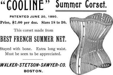 Keywords: COOLINENovember1894.png COOLINE Summer Corset PATENTED JUNE 20 1890 Price 7 00 per doz Sizes 18 to 30 This corset made from BEST FRENCH SUMMER NET Stayed with bone Extra long waist Must be seen to be appreciated WALKER-STETSON-SAWYER-CO BOSTON NEWS FOR BUYERS BOSTON 1894-11 Anonymus PD Image COOLINENovember1894cut png PD-old Hourglass corset Victorian Corset advertisements 1894 advertisements Fashion in 1894 |
