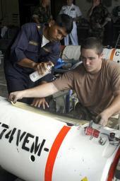 Keywords: Cooperation Afloat Readiness and Training Thailand 2009 DVIDS187256.jpg en Royal Thai Navy Petty Officer 1st Class Prasith Cunchinda and Petty Officer 3rd Class Devin Keeton mineman assigned to Mobile Mine Assembly Unit 10 label training mines in preparation for Cooperation Afloat Readiness and Training Thailand 2009 CARAT is a series of bilateral exercises held annually in Southeast Asia to strengthen relationships and enhance the operational readiness of the participating forces 2009-07-09 Petty Officer 1st Class Thomas Brennan https //www dvidshub net/image/187256 090714-N-+++++-001 2009-07-14 01 54 THUNG PRONG TH PD-USGov-Military-Navy Cooperation Afloat Readiness and Training 2009 Images from DoD uploaded by Fæ |