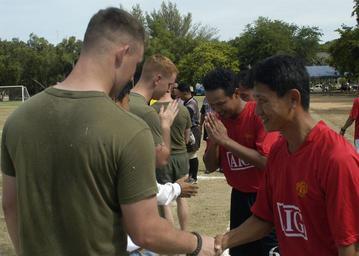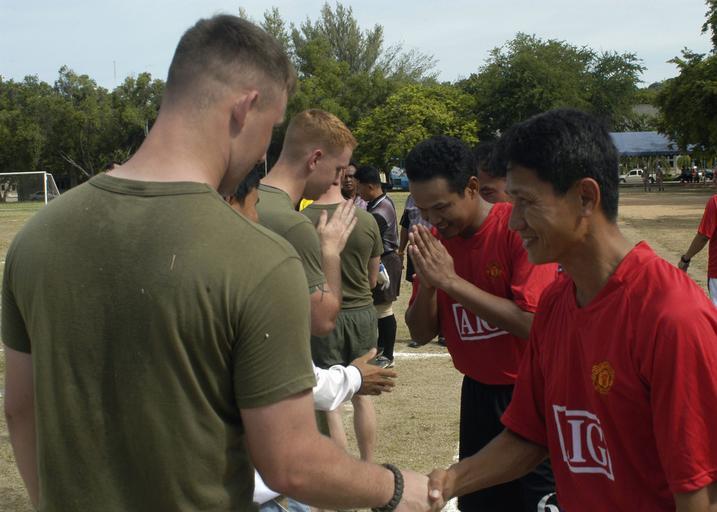 Keywords: Cooperation Readiness Afloat and Training Thailand 2009 DVIDS187803.jpg en U S Marines embarked aboard the dock landing ship USS Harpers Ferry greet opposing Thai soccer players during a sports day for Cooperation Readiness Afloat and Training Thailand 2009 CARAT is a series of bilateral exercises held annually in Southeast Asia to strengthen relationships and enhance the operational readiness of the participating forces 2009-07-12 Petty Officer 2nd Class Jason Tross https //www dvidshub net/image/187803 090712-N-+++++-183 2009-07-15 23 17 SATTAHIP TH PD-USGov-Military-Navy Sattahip Images from DoD uploaded by Fæ |
