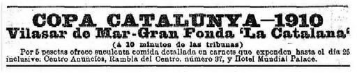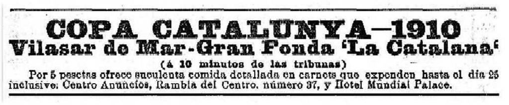 Keywords: Copa-Catalunya-1910-Mundial-Palace-hotel-comida.jpg es Copa Catalunya “ 1910 - Vilasar de Mar “ Gran Fonda La Catalana La Vanguardia Barcelona 21-5-1910 pag 1 Copa Catalunya 1910-05-21 Copa Catalunya “ 1910 Vilasar de Mar “ Gran Fonda La Catalana à 10 minutos de las tribunas Por 5 pesetas ofrece suculenta comida detallada en carnets que expenden hasta el dia 25 inclusivo Centro Anuncios Rambla del Centro numero 37 y Hotel Mundial Palace PD-old ImageNote 1 11 27 953 153 975 202 2 Copa Catalunya “ 1910 Vilasar de Mar “ Gran Fonda La Catalana à 10 minutos de las tribunas Por 5 pesetas ofrece suculenta comida detallada en carnets que expenden hasta el dia 25 inclusivo Centro Anuncios Rambla del Centro numero 37 y Hotel Mundial Palace ImageNoteEnd 1 Copa Catalunya La Vanguardia advertisements 1910 Mundial Palace Hotel 1910 1910 advertisements in Spain |