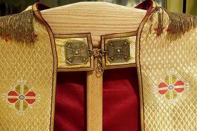 Keywords: Cope worn by Archbishop John J. Mitty, made by H. Fermin Company, The Hague, 19th century, silk, gold thread, view 2 - Saint Ignatius Church, San Francisco, CA - DSC02631.JPG en Exhibit in Saint Ignatius Church San Francisco California USA Photography was permitted without restriction 2015-05-14 17 02 48 own Daderot other versions cc-zero Exhibits in Saint Ignatius Church San Francisco Uploaded with UploadWizard Copes |