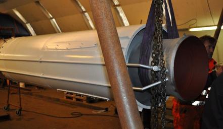 | Keywords: Copenhagen Suborbitals HEAT nozzle2.jpg en Lower part of the half-length 4 m version of the HEAT booster Hybrid Exo Atmospheric Transporter The lower part contains the combined combustion chamber and fuel compartment paraffin wax The graphite nozzle is not veerable The half-length HEAT is expected to launch a crash test dummy to 40 km altitude in June 2010 The full-length HEAT should be able to send one person up in space in a parabolic flight The supersonic wedged fins are not yet fitted The person in the orange overall is Peter Madsen own Necessary Evil 2010-02-13 Picture taken at an open house arrangement for engineers February 13th 2010 at the Copenhagen Suborbitals' lair Copenhagen Suborbitals Hybrid rocket engines Peter Madsen inventor |