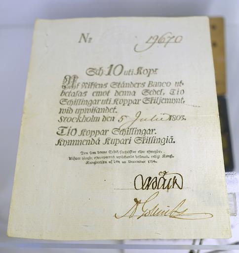 | Keywords: Copper banknote with death threat for counterfeiting, 10 Riksdaler, 1803 AD, TM24662 - Tekniska museet - Stockholm, Sweden - DSC01544.JPG en Exhibit in the Tekniska museet Stockholm Sweden This work is old enough so that it is in the public domain Photography was permitted in the museum without restriction 2014-09-16 own Daderot other versions cc-zero Collections of the Tekniska museet Banknotes of Sweden Banknotes with a face value of 10 | ||||