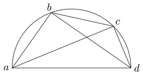 Keywords: Coppernicus 007.svg de à ber die Kreisbewegungen der Weltkörper 7 File Kreisbewegungen-Coppernicus-0 djvu p 34 1879 w Nicolaus Copernicus File Coppernicus7 png PD-old-100 De revolutionibus drawings LaTeX Source Code <syntaxhighlight lang latex > \documentclasstikz convert pdf2svg standalone \begin document \begin tikzpicture \coordinate A at 180 2 ; \coordinate B at 110 2 ; \coordinate C at 45 2 ; \coordinate D at 0 2 ; \draw D arcstart angle 0 end angle 180 radius 2 -- cycle; \draw A -- B ; \draw A -- C ; \draw B -- C ; \draw B -- D ; \draw C -- D ; \draw A + 180 0 2 node a ; \draw B + 110 0 2 node b ; \draw C + 45 0 2 node c ; \draw D + 0 0 2 node d ; \end tikzpicture \end document </syntaxhighlight> |