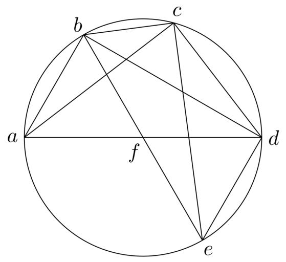 | Keywords: Coppernicus 009.svg de à ber die Kreisbewegungen der Weltkörper 9 File Kreisbewegungen-Coppernicus-0 djvu p 35 1879 w Nicolaus Copernicus File Coppernicus9 png PD-old-100 De revolutionibus drawings LaTeX Source Code <syntaxhighlight lang latex > complile with »pdflatex« \documentclasstikz convert pdf2svg standalone \begin document \begin tikzpicture \draw 0 0 circleradius 2; \pgfmathsetmacro \BFA 120 ; \coordinate A at 180 2 ; \coordinate B at \BFA 2 ; \coordinate C at 75 2 ; \coordinate D at 0 2 ; \coordinate E at \BFA-180 2 ; \draw A -- B ; \draw B -- C ; \draw C -- D ; \draw D -- E ; \draw A -- C ; \draw A -- D ; \draw B -- D ; \draw B -- E ; \draw C -- E ; \draw A + 180 0 2 node a ; \draw B + \BFA 0 2 node b ; \draw C + 75 0 2 node c ; \draw D + 0 0 2 node d ; \draw E + \BFA-180 0 2 node e ; \draw 0 0 + \BFA/2-180 0 3 node f ; \end tikzpicture \end document </syntaxhighlight> |