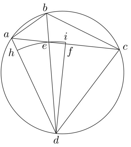 Keywords: Coppernicus 010.svg de à ber die Kreisbewegungen der Weltkörper 10 File Kreisbewegungen-Coppernicus-0 djvu p 36 1879 w Nicolaus Copernicus File Coppernicus10 png PD-old-100 De revolutionibus drawings LaTeX Source Code <syntaxhighlight lang latex > complile with »pdflatex« \documentclasstikz convert pdf2svg standalone \usepackage tkz-euclide \usetkzobj all \begin document \begin tikzpicture \tkzSetUpLineline width 0 4pt \tkzDefPoint 0 0 O \tkzDefPoint 2 0 O1 \tkzDrawCircle O O1 \tkzDefPointByrotation center O angle 146 O1 \tkzGetPoint A \draw A + 146 0 2 node a ; \tkzDefPointByrotation center O angle 105 O1 \tkzGetPoint B \draw B + 105 0 2 node b ; \tkzDefPointByrotation center O angle 22 O1 \tkzGetPoint C \draw C + 22 0 2 node c ; \tkzInterLC/tikz/overlay A B B C \tkzGetFirstPoint X1 \tkzInterCC C B X1 B \tkzGetFirstPoint X2 \tkzInterLC/tikz/overlay B X2 O O1 \tkzGetFirstPoint D \draw D + -90 0 2 node d ; \tkzInterLL B D C A \tkzGetPoint E \draw E + -135 0 2 node e ; \tkzDefLineperpendicular through D /tikz/overlay A C \tkzGetPoint X3 \tkzInterLL X3 D C A \tkzGetPoint F \draw F + -60 0 3 node f ; \tkzInterLC/tikz/overlay A D D E \tkzGetFirstPoint H \draw H + -160 0 2 node h ; \tkzInterLC/tikz/overlay X3 D D E \tkzGetFirstPoint I \draw I + 90 0 2 node i ; \tkzDrawSegment B D \tkzDrawSegment A B \tkzDrawSegment A C \tkzDrawSegment B C \tkzDrawSegment D C \tkzDrawSegment A D \tkzDrawSegment I D \tkzDrawArccolor black D I A \end tikzpicture \end document </syntaxhighlight> |
