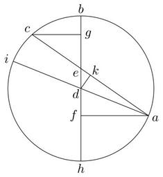 Keywords: Coppernicus 027.svg de à ber die Kreisbewegungen der Weltkörper 27 File Kreisbewegungen-Coppernicus-0 djvu p 55 1879 w Nicolaus Copernicus File Coppernicus_027 png PD-old-100 De revolutionibus drawings LaTeX Source Code <syntaxhighlight lang latex > complile with »pdflatex« \documentclasstikz convert pdf2svg standalone \usetikzlibrary calc intersections \begin document \begin tikzpicture \coordinate A at -22 2 ; \coordinate B at 90 2 ; \coordinate C at 132 2 ; \coordinate D at 0 0 ; \coordinate F at B - A ; \coordinate G at B - C ; \coordinate H at -90 2 ; \coordinate I at 158 2 ; \coordinate K at A 5 C ; \draw D circleradius 2cm; \draw I -- A ; \pathdraw name path lineAC A -- C ; \pathdraw name path lineHB H -- B ; \pathname intersections of lineAC and lineHB name sectionE ; \coordinate E at sectionE-1 ; \draw D -- K ; \draw C -- G ; \draw F -- A ; \draw A + -22 0 2 node a ; \draw B + 90 0 2 node b ; \draw C + 132 0 2 node c ; \draw D + -135 0 2 node d ; \draw E + -135 0 2 node e ; \draw F + 180 0 2 node f ; \draw G + 0 0 2 node g ; \draw H + -90 0 2 node h ; \draw I + 158 0 2 node i ; \draw K + 45 0 2 node k ; \end tikzpicture \end document </syntaxhighlight> |