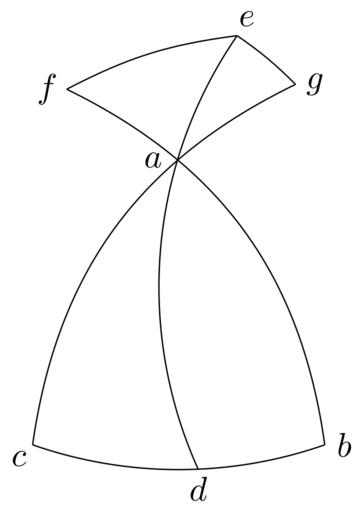 Keywords: Coppernicus 028.svg de à ber die Kreisbewegungen der Weltkörper 28 File Kreisbewegungen-Coppernicus-0 djvu p 56 1879 w Nicolaus Copernicus File Coppernicus_028 png PD-old-100 De revolutionibus drawings LaTeX Source Code <syntaxhighlight lang latex > complile with »pdflatex« \documentclasstikz convert pdf2svg standalone \usepackage tkz-euclide \usetkzobj all \begin document \begin tikzpicture \tkzSetUpLineline width 0 4pt \tkzDefPoint 3 0 B \tkzDefPoint 0 0 C \tkzDefPoint 1 7 -0 25 D \tkzDefPoint 2 1 4 2 E \tkzDefPoint 2 7 3 7 G \tkzDefPoint 0 35 3 65 F \pathdraw name path lineCG C to bend left 28 G ; \pathdraw name path lineFB F to bend left 28 B ; \draw F to bend left 10 E ; \draw E to bend left 5 G ; \pathname intersections of lineCG and lineFB name sectionA ; \coordinate A at sectionA-1 ; \begin pgfinterruptboundingbox \tkzCircumCenter C D B \tkzGetPoint O1 \tkzCircumCenter E A D \tkzGetPoint O2 \end pgfinterruptboundingbox \tkzDrawArccolor black O1 C B \tkzDrawArccolor black O2 E D \draw A + 180 0 25 node a ; \draw B + 0 0 2 node b ; \draw C + -135 0 2 node c ; \draw D + -90 0 2 node d ; \draw E + 60 0 2 node e ; \draw F + 180 0 2 node f ; \draw G + 0 0 2 node g ; \end tikzpicture \end document </syntaxhighlight>