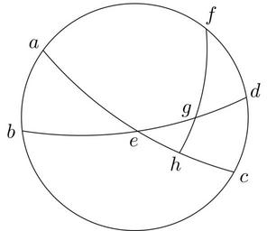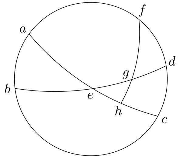 Keywords: Coppernicus 034.svg de à ber die Kreisbewegungen der Weltkörper 34 File Kreisbewegungen-Coppernicus-0 djvu p 70 1879 w Nicolaus Copernicus File Coppernicus_034 png PD-old-100 De revolutionibus drawings LaTeX Source Code <syntaxhighlight lang latex > complile with »pdflatex« \documentclasstikz convert pdf2svg standalone \usepackage tkz-euclide \usetkzobj all \begin document \begin tikzpicture \tkzSetUpLineline width 0 4pt \tkzDefPoint 144 2 A \tkzDefPoint -173 2 B \tkzDefPoint -29 2 C \tkzDefPoint 10 2 D \tkzDefPoint 0 0 E' \tkzDefPoint 0 05 -0 25 E \tkzDefPoint 51 2 F \begin pgfinterruptboundingbox \tkzCircumCenter A E C \tkzGetPoint O1 \tkzCircumCenter B E D \tkzGetPoint O2 \end pgfinterruptboundingbox \tkzDefPointByrotation center O1 angle 7 2 E \tkzGetPoint H \tkzDefPointByrotation center O2 angle 9 E \tkzGetPoint G \begin pgfinterruptboundingbox \tkzCircumCenter F G H \tkzGetPoint O3 \end pgfinterruptboundingbox \tkzDrawCircle E' A \tkzDrawArccolor black O1 A C \tkzDrawArccolor black O2 B D \tkzDrawArccolor black O3 H F \draw A + 144 0 2 node a ; \draw B + 180 0 2 node b ; \draw C + -30 0 2 node c ; \draw D + 40 0 2 node d ; \draw E + -110 0 2 node e ; \draw F + 70 0 25 node f ; \draw G + 140 0 2 node g ; \draw H + -110 0 2 node h ; \end tikzpicture \end document </syntaxhighlight> |