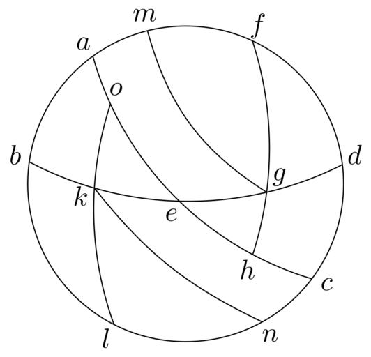 Keywords: Coppernicus 035.svg de à ber die Kreisbewegungen der Weltkörper 35 File Kreisbewegungen-Coppernicus-0 djvu p 71 1879 w Nicolaus Copernicus File Coppernicus_035 png PD-old-100 De revolutionibus drawings LaTeX Source Code <syntaxhighlight lang latex > complile with »pdflatex« \documentclasstikz convert pdf2svg standalone \usepackage tkz-euclide \usetkzobj all \begin document \begin tikzpicture \tkzSetUpLineline width 0 4pt \tkzDefPoint 126 2 A \tkzDefPoint 172 2 B \tkzDefPoint -37 2 C \tkzDefPoint 7 2 D \tkzDefPoint 0 0 E' \tkzDefPoint -0 08 -0 22 E \tkzDefPoint 65 2 F \tkzDefPoint -117 2 L \tkzDefPoint 104 2 M \tkzDefPoint -61 2 N \begin pgfinterruptboundingbox \tkzCircumCenter A E C \tkzGetPoint O1 \tkzCircumCenter B E D \tkzGetPoint O2 \end pgfinterruptboundingbox \tkzDefPointByrotation center O1 angle 16 1 E \tkzGetPoint H \tkzDefPointByrotation center O1 angle -21 2 E \tkzGetPoint O \tkzDefPointByrotation center O2 angle 14 8 E \tkzGetPoint G \tkzDefPointByrotation center O2 angle -14 5 E \tkzGetPoint K \begin pgfinterruptboundingbox \tkzCircumCenter F G H \tkzGetPoint O3 \tkzCircumCenter L K O \tkzGetPoint O4 \end pgfinterruptboundingbox \tkzDrawCircle E' A \tkzDrawArccolor black O1 A C \tkzDrawArccolor black O2 B D \tkzDrawArccolor black O3 H F \tkzDrawArccolor black O4 O L \draw G tobend left 21 M ; \draw N tobend left 13 K ; \draw A + 127 0 2 node a ; \draw B + 153 0 2 node b ; \draw C + -20 0 2 node c ; \draw D + 40 0 2 node d ; \draw E + -120 0 2 node e ; \draw F + 70 0 2 node f ; \draw G + 50 0 25 node g ; \draw H + -110 0 2 node h ; \draw K + -150 0 2 node k ; \draw L + -120 0 2 node l ; \draw M + 100 0 2 node m ; \draw N + -60 0 2 node n ; \draw O + 70 0 2 node o ; \end tikzpicture \end document </syntaxhighlight>