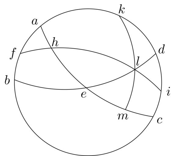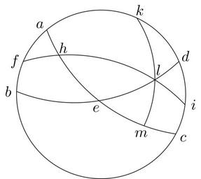 | Keywords: Coppernicus 037.svg de à ber die Kreisbewegungen der Weltkörper 37 File Kreisbewegungen-Coppernicus-0 djvu p 80 1879 w Nicolaus Copernicus File Coppernicus_037 png PD-old-100 De revolutionibus drawings LaTeX Source Code <syntaxhighlight lang latex > complile with »pdflatex« \documentclasstikz convert pdf2svg standalone \usepackage tkz-euclide \usetkzobj all \begin document \begin tikzpicture \tkzSetUpLineline width 0 4pt \tkzDefPoint 130 2 A \tkzDefPoint 178 2 B \tkzDefPoint -28 2 C \tkzDefPoint 23 2 D \tkzDefPoint 0 0 E' \tkzDefPoint -0 05 -0 15 E \tkzDefPoint 157 2 F \tkzDefPoint -7 2 I \tkzDefPoint 65 2 K \begin pgfinterruptboundingbox \tkzCircumCenter A E C \tkzGetPoint O1 \tkzCircumCenter B E D \tkzGetPoint O2 \end pgfinterruptboundingbox \tkzDefPointByrotation center O1 angle 18 E \tkzGetPoint M \tkzDefPointByrotation center O2 angle 22 5 E \tkzGetPoint L \begin pgfinterruptboundingbox \tkzCircumCenter K L M \tkzGetPoint O3 \tkzCircumCenter F L I \tkzGetPoint O4 \tkzInterCC O1 A O4 I \tkzGetPoints H2 H \end pgfinterruptboundingbox \tkzDrawCircle E' A \tkzDrawArccolor black O1 A C \tkzDrawArccolor black O2 B D \tkzDrawArccolor black O3 M K \tkzDrawArccolor black O4 I F \draw A + 144 0 2 node a ; \draw B + 180 0 2 node b ; \draw C + -30 0 2 node c ; \draw D + 40 0 2 node d ; \draw E + -110 0 2 node e ; \draw F + 180 0 2 node f ; \draw H + 60 0 2 node h ; \draw I + 0 0 2 node i ; \draw K + 70 0 2 node k ; \draw L + 70 0 25 node l ; \draw M + -110 0 2 node m ; \end tikzpicture \end document </syntaxhighlight> |