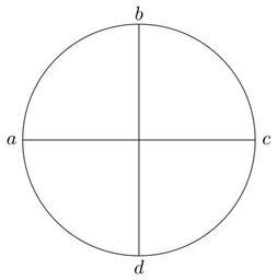 Keywords: Coppernicus 045.svg de à ber die Kreisbewegungen der Weltkörper 45 File Kreisbewegungen-Coppernicus-0 djvu p 141 1879 w Nicolaus Copernicus File Coppernicus_045 png PD-old-100 De revolutionibus drawings LaTeX Source Code <syntaxhighlight lang latex > complile with »pdflatex« \documentclasstikz convert pdf2svg standalone \begin document \begin tikzpicture \pgfmathsetmacro \radius 2 1 ; \draw 0 0 circleradius \radius; \coordinate A at 180 \radius ; \coordinate B at 90 \radius ; \coordinate C at 0 \radius ; \coordinate D at -90 \radius ; \draw A -- C ; \draw B -- D ; \draw A + 180 0 2 node a ; \draw B + 90 0 2 node b ; \draw C + 0 0 2 node c ; \draw D + -90 0 2 node d ; \end tikzpicture \end document </syntaxhighlight> |