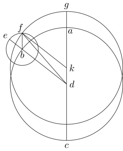 Keywords: Coppernicus 053.svg de à ber die Kreisbewegungen der Weltkörper 53 File Kreisbewegungen-Coppernicus-0 djvu p 172 1879 w Nicolaus Copernicus File Coppernicus_053 png PD-old-100 De revolutionibus drawings LaTeX Source Code <syntaxhighlight lang latex > complile with »pdflatex« \documentclasstikz convert pdf2svg standalone \usetikzlibrary calc \begin document \begin tikzpicture \pgfmathsetmacro \DA 2 1 ; \pgfmathsetmacro \DK 0 6 ; \pgfmathsetmacro \ADB 142 ; \coordinate A at 90 \DA ; \coordinate B at \ADB \DA ; \coordinate C at -90 \DA ; \coordinate D at 0 0 ; \coordinate E at \ADB \DA+\DK ; \coordinate F at B + 90 \DK ; \coordinate G at 90 \DA+\DK ; \coordinate K at 90 \DK ; \draw D circleradius \DA; \draw K circleradius \DA; \draw B circleradius \DK; \draw G -- C ; \draw F -- K ; \draw E -- D ; \draw F -- D ; \draw F -- B ; \draw A + -45 0 2 node a ; \draw B + -90 0 2 node b ; \draw C + -90 0 2 node c ; \draw D + 0 0 2 node d ; \draw E + \ADB 0 2 node e ; \draw F + 110 0 2 node f ; \draw G + 90 0 2 node g ; \draw K + 0 0 2 node k ; \end tikzpicture \end document </syntaxhighlight> |