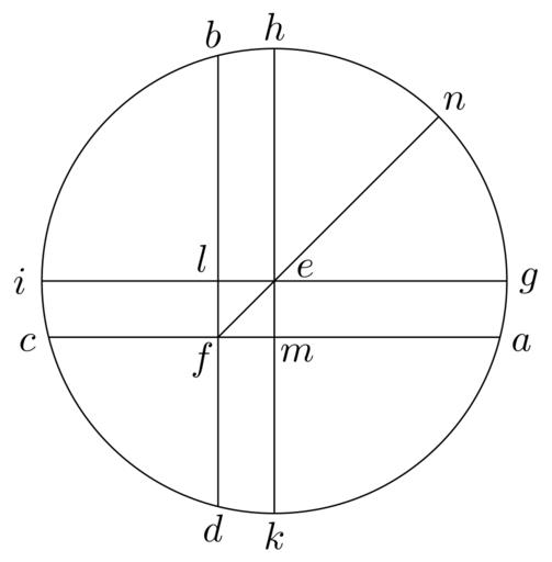 Keywords: Coppernicus 057.svg de à ber die Kreisbewegungen der Weltkörper 57 File Kreisbewegungen-Coppernicus-0 djvu p 174 1879 w Nicolaus Copernicus File Coppernicus_057 png PD-old-100 De revolutionibus drawings LaTeX Source Code <syntaxhighlight lang latex > complile with »pdflatex« \documentclasstikz convert pdf2svg standalone \begin document \begin tikzpicture \pgfmathsetmacro \EA 2 1 ; \pgfmathsetmacro \AEG 14 ; \coordinate A at -\AEG \EA ; \coordinate B at 90+\AEG \EA ; \coordinate C at 180+\AEG \EA ; \coordinate D at -90-\AEG \EA ; \coordinate E at 0 0 ; \coordinate F at B -C ; \coordinate G at 0 \EA ; \coordinate H at 90 \EA ; \coordinate I at 180 \EA ; \coordinate K at -90 \EA ; \coordinate L at B -I ; \coordinate M at K -C ; \coordinate N at 45 \EA ; \draw E circleradius \EA; \draw C -- A ; \draw I -- G ; \draw B -- D ; \draw H -- K ; \draw F -- N ; \draw A + -\AEG 0 2 node a ; \draw B + 90+\AEG 0 2 node b ; \draw C + 180+\AEG 0 2 node c ; \draw D + -90-\AEG 0 2 node d ; \draw E + 22 0 3 node e ; \draw F + -125 0 25 node f ; \draw G + 0 0 2 node g ; \draw H + 90 0 2 node h ; \draw I + 180 0 2 node i ; \draw K + -90 0 2 node k ; \draw L + 125 0 25 node l ; \draw M + -35 0 25 node m ; \draw N + 45 0 2 node n ; \end tikzpicture \end document </syntaxhighlight> |