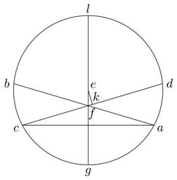 Keywords: Coppernicus 058.svg de à ber die Kreisbewegungen der Weltkörper 58 File Kreisbewegungen-Coppernicus-0 djvu p 176 1879 w Nicolaus Copernicus File Coppernicus_058 png PD-old-100 De revolutionibus drawings LaTeX Source Code <syntaxhighlight lang latex > complile with »pdflatex« \documentclasstikz convert pdf2svg standalone \usetikzlibrary calc intersections \begin document \begin tikzpicture \pgfmathsetmacro \EG 2 1 ; \pgfmathsetmacro \GFA 62 ; \pgfmathsetmacro \GFB 95 ; \coordinate A at -90+\GFA \EG ; \coordinate B at -90-\GFB \EG ; \coordinate C at -90-\GFA \EG ; \coordinate D at -90+\GFB \EG ; \coordinate E at 0 0 ; \coordinate G at -90 \EG ; \coordinate K at C 5 D ; \coordinate L at 90 \EG ; \draw E circleradius \EG; \draw L -- G ; \draw C -- A ; \pathdraw name path lineCD C -- D ; \pathdraw name path lineBA B -- A ; \pathname intersections of lineCD and lineBA name sectionF ; \coordinate F at sectionF-1 ; \draw E -- K ; \draw A + -90+\GFA 0 2 node a ; \draw B + -90-\GFB 0 2 node b ; \draw C + -90-\GFA 0 2 node c ; \draw D + -90+\GFB 0 2 node d ; \draw E + 45 0 2 node e ; \draw F + -65 0 25 node f ; \draw G + -90 0 2 node g ; \draw K + 65 0 25 node k ; \draw L + 90 0 2 node l ; \end tikzpicture \end document </syntaxhighlight> |