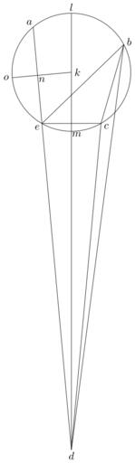 Keywords: Coppernicus 069.svg de à ber die Kreisbewegungen der Weltkörper 69 File Kreisbewegungen-Coppernicus-0 djvu p 208 1879 w Nicolaus Copernicus File Coppernicus_069 png PD-old-100 De revolutionibus drawings LaTeX Source Code <syntaxhighlight lang latex > complile with »pdflatex« \documentclasstikz convert pdf2svg standalone \usepackage tkz-euclide \usetkzobj all \begin document \begin tikzpicture \tkzSetUpLineline width 0 4pt \pgfmathsetmacro \KL 1 95 ; \tkzDefPoint 130 \KL A \tkzDefPoint 28 \KL B \tkzDefPoint -60 \KL C \tkzDefPoint -90 6 4 \KL D \tkzDefPoint 0 0 K \tkzDefPoint 90 \KL L \tkzDefPoint 90 -\KL M \begin pgfinterruptboundingbox \tkzInterLC A D K A \tkzGetPoints E A \end pgfinterruptboundingbox \coordinate N at A K D ; \tkzInterLC N K K A \tkzGetPoints O O2 \tkzDrawCircle K A \draw A -- D ; \draw B -- D ; \draw C -- D ; \draw C -- E ; \draw B -- C ; \draw L -- D ; \draw B -- E ; \draw O -- K ; \draw A + 130 0 2 node a ; \draw B + 28 0 2 node b ; \draw C + -30 0 2 node c ; \draw D + -90 0 2 node d ; \draw E + -140 0 2 node e ; \draw K + 0 0 2 node k ; \draw L + 90 0 2 node l ; \draw M + -30 0 2 node m ; \draw N + -45 0 2 node n ; \draw O + 180 0 2 node o ; \end tikzpicture \end document </syntaxhighlight> |