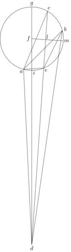Keywords: Coppernicus 071.svg de à ber die Kreisbewegungen der Weltkörper 71 File Kreisbewegungen-Coppernicus-0 djvu p 212 1879 w Nicolaus Copernicus File Coppernicus_071 png PD-old-100 De revolutionibus drawings LaTeX Source Code <syntaxhighlight lang latex > complile with »pdflatex« \documentclasstikz convert pdf2svg standalone \usepackage tkz-euclide \usetkzobj all \begin document \begin tikzpicture \tkzSetUpLineline width 0 4pt \pgfmathsetmacro \FG 1 94 ; \tkzDefPoint -105 \FG A \tkzDefPoint 15 \FG B \tkzDefPoint 60 \FG C \tkzDefPoint -90 6 5 \FG D \tkzDefPoint 0 0 F \tkzDefPoint 90 \FG G \tkzDefPoint 90 -\FG I \begin pgfinterruptboundingbox \tkzInterLC C D F C \tkzGetPoints C E \end pgfinterruptboundingbox \coordinate L at C F D ; \tkzInterLC L F F C \tkzGetPoints M M2 \tkzDrawCircle F C \draw C -- D ; \draw C -- A ; \draw B -- D ; \draw A -- D ; \draw A -- E ; \draw B -- A ; \draw G -- D ; \draw B -- E ; \draw M -- F ; \draw A + -135 0 2 node a ; \draw B + 28 0 2 node b ; \draw C + 65 0 2 node c ; \draw D + -90 0 2 node d ; \draw E + -45 0 2 node e ; \draw F + 180 0 2 node f ; \draw G + 90 0 2 node g ; \draw I + -45 0 2 node i ; \draw L + 60 0 2 node l ; \draw M + 0 0 2 node m ; \end tikzpicture \end document </syntaxhighlight> |