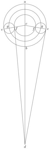 Keywords: Coppernicus 072.svg de à ber die Kreisbewegungen der Weltkörper 72 File Kreisbewegungen-Coppernicus-0 djvu p 215 1879 w Nicolaus Copernicus File Coppernicus_072 png PD-old-100 De revolutionibus drawings LaTeX Source Code <syntaxhighlight lang latex > complile with »pdflatex« \documentclasstikz convert pdf2svg standalone \usepackage tkz-euclide \usetkzobj all \begin document \begin tikzpicture \tkzSetUpLineline width 0 4pt \pgfmathsetmacro \CA 2 1 ; \tkzDefPoint 90 \CA A \tkzDefPoint -90 \CA B \tkzDefPoint 0 0 C \tkzDefPoint -90 5 6 \CA D \tkzDrawCircle C A \tkzTangentfrom with R D C \CA cm \tkzGetPoints E2 E \coordinate F at C 5 E ; \coordinate F2 at C 5 E2 ; \coordinate G at E 5 F ; \coordinate G2 at E2 5 F2 ; \tkzDrawCircle C F \tkzDrawCircle C G \tkzDrawCircle G F \tkzDrawCircle G2 F2 \draw A -- D ; \draw C -- E ; \draw C -- E2 ; \draw D -- E2 ; \draw D -- F ; \draw A + 90 0 2 node a ; \draw B + -45 0 2 node b ; \draw C + 45 0 2 node c ; \draw D + -90 0 2 node d ; \draw E + -160 0 2 node e ; \draw E2 + 0 0 2 node e ; \draw F + -35 0 25 node f ; \draw F2 + -135 0 25 node f ; \draw G + 140 0 2 node g ; \draw G2 + 45 0 2 node g ; \end tikzpicture \end document </syntaxhighlight> |