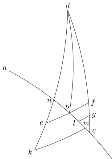 Keywords: Coppernicus 087.svg de à ber die Kreisbewegungen der Weltkörper 87 File Kreisbewegungen-Coppernicus-0 djvu p 244 1879 w Nicolaus Copernicus File Coppernicus_087 png PD-old-100 De revolutionibus drawings LaTeX Source Code <syntaxhighlight lang latex > complile with »pdflatex« \documentclasstikz convert pdf2svg standalone \usepackage tkz-euclide \usetkzobj all \begin document \begin tikzpicture \tkzSetUpLineline width 0 4pt \tkzDefPoint 0 1 87 A \tkzDefPoint 2 7 0 B \tkzDefPoint 3 6 -0 87 C \tkzDefPoint 2 62 4 55 D \tkzDefPoint 1 66 -0 45 E \tkzDefPoint 3 55 0 45 F \begin pgfinterruptboundingbox \tkzCircumCenter A B C \tkzGetPoint ABC \tkzCircumCenter E B F \tkzGetPoint FBE \tkzCircumCenter D F C \tkzGetPoint DFC \end pgfinterruptboundingbox \tkzDefPointByrotation center ABC angle -6 2 C \tkzGetPoint C' \tkzDefPointByrotation center DFC angle 2 9 C \tkzGetPoint G \tkzDefPointByrotation center ABC angle 2 9 C \tkzGetPoint L \tkzDefPointByrotation center ABC angle -4 B \tkzGetPoint M \tkzDefPointByrotation center ABC angle 3 7 B \tkzGetPoint N \begin pgfinterruptboundingbox \tkzCircumCenter D N E \tkzGetPoint DNE \end pgfinterruptboundingbox \tkzDefPointByrotation center DNE angle -5 E \tkzGetPoint K \tkzDrawArccolor black ABC C' A \tkzDrawArccolor black DNE K D \tkzDrawArccolor black FBE E F \tkzDrawArccolor black DFC C D \draw G to bend left 3 L ; \draw D to bend left 9 B ; \draw M to bend left 5 K ; \draw A + 150 0 2 node a ; \draw B + 110 0 3 node b ; \draw C + 20 0 2 node c ; \draw D + 90 0 2 node d ; \draw E + 180 0 2 node e ; \draw F + 0 0 2 node f ; \draw G + 0 0 2 node g ; \draw K + -160 0 2 node k ; \draw L + -160 0 2 node l ; \draw M + 80 0 2 node \footnotesize m ; \draw N + -170 0 2 node n ; \end tikzpicture \end document </syntaxhighlight> |