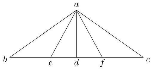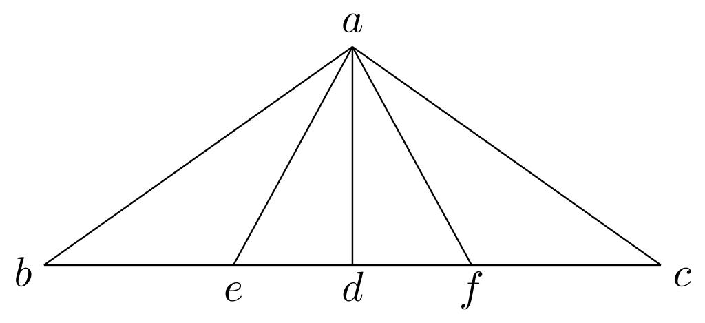 Keywords: Coppernicus 088.svg de à ber die Kreisbewegungen der Weltkörper 88 File Kreisbewegungen-Coppernicus-0 djvu p 251 1879 w Nicolaus Copernicus File Coppernicus_088 png PD-old-100 De revolutionibus drawings LaTeX Source Code <syntaxhighlight lang latex > complile with »pdflatex« \documentclasstikz convert pdf2svg standalone \begin document \begin tikzpicture \pgfmathsetmacro \DB 2 59 ; \pgfmathsetmacro \DE 1 ; \coordinate A at 0 1 83 ; \coordinate B at -\DB 0 ; \coordinate C at \DB 0 ; \coordinate D at 0 0 ; \coordinate E at -\DE 0 ; \coordinate F at \DE 0 ; \draw A -- B ; \draw A -- C ; \draw A -- D ; \draw A -- E ; \draw A -- F ; \draw B -- C ; \draw A + 90 0 2 node a ; \draw B + -135 0 25 nodeanchor base b ; \draw C + -45 0 25 nodeanchor base c ; \draw D + -90 0 3 nodeanchor base d ; \draw E + -90 0 3 nodeanchor base e ; \draw F + -90 0 3 nodeanchor base f ; \end tikzpicture \end document </syntaxhighlight> |