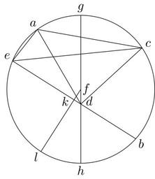 Keywords: Coppernicus 103.svg de à ber die Kreisbewegungen der Weltkörper 103 File Kreisbewegungen-Coppernicus-0 djvu p 287 1879 w Nicolaus Copernicus File Coppernicus_103 png PD-old-100 De revolutionibus drawings LaTeX Source Code <syntaxhighlight lang latex > complile with »pdflatex« \documentclasstikz convert pdf2svg standalone \usepackage tkz-euclide \usetkzobj all \begin document \begin tikzpicture \tkzSetUpLineline width 0 4pt \pgfmathsetmacro \FA 2 06 ; \tkzDefPoint 126 \FA A \tkzDefPoint -42 \FA B \tkzDefPoint 34 \FA C \tkzDefPoint -90 0 2 \FA D \tkzDefPoint 0 0 F \tkzDefPoint 90 \FA G \tkzDefPoint -90 \FA H \tkzInterLC B D F A \tkzGetPoints B E \coordinate K at B F E ; \tkzInterLC F K F A \tkzGetPoints L2 L \tkzDrawCircle F A \draw A -- C ; \draw A -- D ; \draw A -- E ; \draw C -- D ; \draw C -- E ; \draw B -- E ; \draw F -- L ; \draw G -- H ; \draw A + 126 0 2 node a ; \draw B + -42 0 2 node b ; \draw C + 34 0 2 node c ; \draw D + 20 0 25 node d ; \draw E + 138 0 2 node e ; \draw F + 0 0 15 node f ; \draw G + 90 0 2 node g ; \draw H + -90 0 2 node h ; \draw K + -170 0 25 node k ; \draw L + -132 0 2 node l ; \end tikzpicture \end document </syntaxhighlight> |