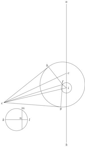Keywords: Coppernicus 119.svg de à ber die Kreisbewegungen der Weltkörper 119 File Kreisbewegungen-Coppernicus-0 djvu p 314 1879 w Nicolaus Copernicus File Coppernicus_119 png PD-old-100 De revolutionibus drawings LaTeX Source Code <syntaxhighlight lang latex > complile with »pdflatex« \documentclasstikz convert pdf2svg standalone \usepackage tkz-euclide \usetkzobj all \begin document \begin tikzpicture \tkzSetUpLineline width 0 4pt \pgfmathsetmacro \CA 6 9 ; \pgfmathsetmacro \XK 0 16 \CA ; \pgfmathsetmacro \dot 0 05 ; \tkzDefPoint 90 \CA A \tkzDefPoint -90 \CA B \tkzDefPoint 0 0 C \tkzDefPoint -155 \CA E \tkzDefPoint -90 0 21 \CA I \coordinate F at I + 140 0 075 \CA ; \coordinate F2 at F + 0 0 325 \CA ; \tkzDefPoint -137 2 0 985 \CA X \coordinate K at X + 180 \XK ; \coordinate M at X + 60 \XK ; \coordinate N at K- M ; \tkzTangentfrom E F F2 \tkzGetPoints G H \begin pgfinterruptboundingbox \tkzInterLC X K X K \tkzGetPoints L K \tkzInterLC M N X K \tkzGetPoints M M2 \end pgfinterruptboundingbox \tkzDrawCircle I F \tkzDrawCircle F F2 \tkzDrawCircle X K \draw A -- B ; \draw C -- E ; \draw E -- F ; \draw E -- G ; \draw E -- H ; \draw E -- I ; \draw F -- G ; \draw F -- H ; \draw F -- I ; \draw K -- L ; \draw M -- M2 ; \draw A + 90 0 2 node a ; \draw B + -90 0 2 node b ; \draw C + 0 0 2 node c ; \draw E + -155 0 2 node e ; \draw F + 90 0 25 node f ; \draw G + -90 0 2 node g ; \draw H + 130 0 2 node h ; \draw I + 0 0 2 node i ; \draw K + 180 0 2 node k ; \draw L + 0 0 2 node l ; \draw M + 60 0 2 node m ; \draw N + 135 0 2 node n ; \end tikzpicture \end document </syntaxhighlight> |