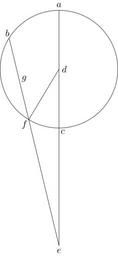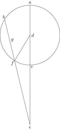 Keywords: Coppernicus 127.svg de à ber die Kreisbewegungen der Weltkörper 127 File Kreisbewegungen-Coppernicus-0 djvu p 335 1879 w Nicolaus Copernicus File Coppernicus_127 png PD-old-100 De revolutionibus drawings LaTeX Source Code <syntaxhighlight lang latex > complile with »pdflatex« \documentclasstikz convert pdf2svg standalone \usepackage tkz-euclide \usetkzobj all \begin document \begin tikzpicture \tkzSetUpLineline width 0 4pt \pgfmathsetmacro \DA 2 23 ; \tkzDefPoint 90 \DA A \tkzDefPoint 148 \DA B \tkzDefPoint -90 \DA C \tkzDefPoint 0 0 D \tkzDefPoint -90 3 \DA E \begin pgfinterruptboundingbox \tkzInterLC B E D A \tkzGetPoints F B \end pgfinterruptboundingbox \coordinate G at F 0 5 B ; \tkzDrawCircle D A \draw A -- E ; \draw B -- E ; \draw D -- F ; \draw A + 90 0 2 node a ; \draw B + 110 0 2 node b ; \draw C + -45 0 2 node c ; \draw D + 0 0 2 node d ; \draw E + -90 0 2 node e ; \draw F + -130 0 25 node f ; \draw G + 0 0 2 node g ; \end tikzpicture \end document </syntaxhighlight> |