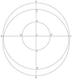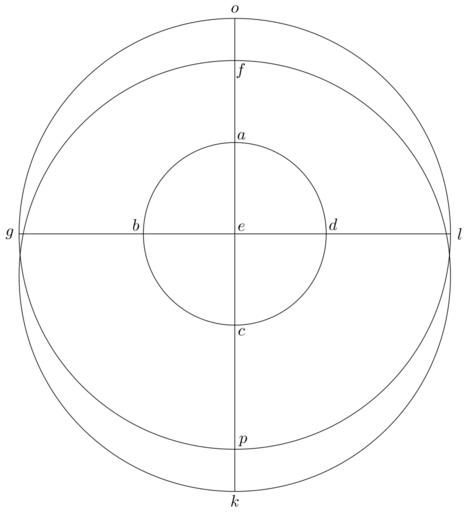 Keywords: Coppernicus 128.svg de à ber die Kreisbewegungen der Weltkörper 128 File Kreisbewegungen-Coppernicus-0 djvu p 340 1879 w Nicolaus Copernicus File Coppernicus_128 png PD-old-100 De revolutionibus drawings LaTeX Source Code <syntaxhighlight lang latex > complile with »pdflatex« \documentclasstikz convert pdf2svg standalone \usepackage tkz-euclide \usetkzobj all \begin document \begin tikzpicture \tkzSetUpLineline width 0 4pt \pgfmathsetmacro \EA 1 95 ; \pgfmathsetmacro \EO 4 6 ; \pgfmathsetmacro \FO 0 9 ; \tkzDefPoint 90 \EA A \tkzDefPoint 180 \EA B \tkzDefPoint -90 \EA C \tkzDefPoint 0 \EA D \tkzDefPoint 0 0 E \tkzDefPoint 90 \EO-\FO F \tkzDefPoint 180 \EO G \tkzDefPoint -90 \EO+\FO K \tkzDefPoint 0 \EO L \tkzDefPoint 90 \EO O \tkzDefPoint -90 \EO P \tkzDefPoint -90 \FO X \tkzDrawCircle E A \tkzDrawCircle E O \tkzDrawCircle X F \draw G -- L ; \draw O -- K ; \draw A + 45 0 2 node a ; \draw B + 130 0 25 node b ; \draw C + -45 0 2 node c ; \draw D + 55 0 25 node d ; \draw E + 45 0 2 node e ; \draw F + -60 0 25 node f ; \draw G + 180 0 2 node g ; \draw K + -90 0 2 node k ; \draw L + 0 0 2 node l ; \draw O + 90 0 2 node o ; \draw P + 45 0 25 node p ; \end tikzpicture \end document </syntaxhighlight> |