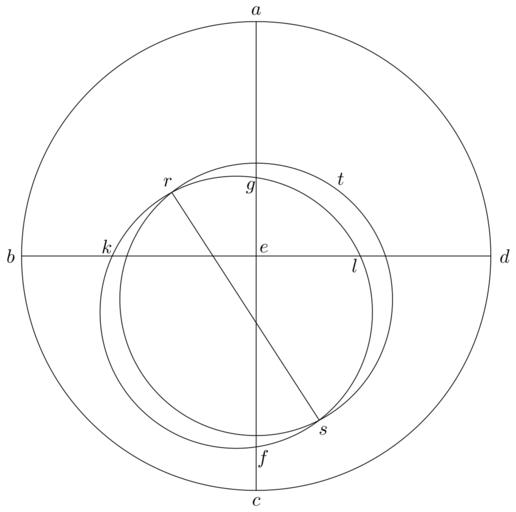 Keywords: Coppernicus 129.svg de à ber die Kreisbewegungen der Weltkörper 129 File Kreisbewegungen-Coppernicus-0 djvu p 342 1879 w Nicolaus Copernicus File Coppernicus_129 png PD-old-100 De revolutionibus drawings LaTeX Source Code <syntaxhighlight lang latex > complile with »pdflatex« \documentclasstikz convert pdf2svg standalone \usepackage tkz-euclide \usetkzobj all \begin document \begin tikzpicture \tkzSetUpLineline width 0 4pt \pgfmathsetmacro \EA 4 27 ; \tkzDefPoint 90 \EA A \tkzDefPoint 180 \EA B \tkzDefPoint -90 \EA C \tkzDefPoint 0 \EA D \tkzDefPoint 0 0 E \tkzDefPoint 0 -0 185 \EA O1 \tkzDefPoint -0 085 \EA -0 24 \EA O2 \tkzDefPoint -69 0 75 \EA S \begin pgfinterruptboundingbox \tkzInterCC O1 S O2 S \tkzGetPoints S R \tkzInterLC B D O2 S \tkzGetPoints K L \tkzInterLC A C O2 S \tkzGetPoints G F \end pgfinterruptboundingbox \tkzDefPointByrotation center O1 angle 117 S \tkzGetPoint T \tkzDrawCircle E A \tkzDrawCircle O1 S \tkzDrawCircle O2 S \draw A -- C ; \draw B -- D ; \draw R -- S ; \draw A + 90 0 2 node a ; \draw B + 180 0 2 node b ; \draw C + -90 0 2 node c ; \draw D + 0 0 25 node d ; \draw E + 45 0 2 node e ; \draw F + -60 0 25 node f ; \draw G + -120 0 2 node g ; \draw K + 120 0 2 node k ; \draw L + -120 0 2 node l ; \draw R + 111 0 2 node r ; \draw S + -69 0 2 node s ; \draw T + 60 0 2 node t ; \end tikzpicture \end document </syntaxhighlight> |