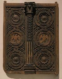 Keywords: Coptic - Cupboard Doors - Walters 61303.jpg Walters Art Museum artwork Anonymous Coptic <br/> These wooden panels are the finest and most complete examples to survive from the Early Byzantine period having been preserved in the dry sands of Egypt The panels made for a cupboard or cabinet or possibly used as window shutters each have richly carved medallions of interlacing bands set with rosettes or eagles A very similar pair of wooden doors is in Athens Benaki Museum inv 9083 century 5 7 Late Antique wood cm 47 4 34 8 4 8 accession number 61 303 12961 Dikran Kelekian Constantinople and Paris by purchase Charles Kelekian New York 1951 by inheritance Walters Art Museum 1951 by purchase Museum purchase 1951 Beyond the Pharaohs Egypt and the Copts in the Second to Seventh Centuries A D Museum of Art Rhode Island School of Design Providence; The Walters Art Gallery Baltimore 1989 place of origin Egypt Walters Art Museum license Furniture in the Walters Art Museum Ancient Roman art in the Walters Art Museum Coptic art in the Walters Art Museum Media contributed by the Walters Art Museum needs artist review Eagles in art |