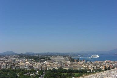Keywords: Corfu town.3.2009.JPG en A view of Corfu city from the top of Old Fortress It shows the port with two ships of them a Cruise ship In the centre of the image is the New fortress In the background is the hills and mountains with a blue and none cloudy sky's 2009-07-18 own Ryan kirk cc-by-sa-3 0 PD-EEA Uploaded with UploadWizard Corfu |